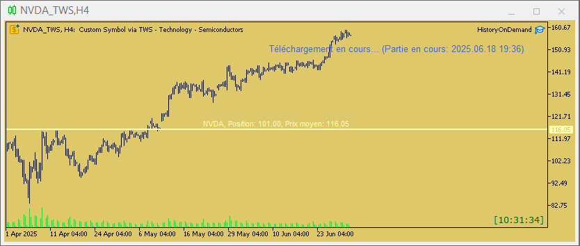 Vous avez un indicateur d'avancement du téléchargement. Si vous lancez plusieurs HistoryOnDemand sur plusieurs graphiques, ils seront exécutés Séquentiellement et soumis au "pacing". Cela peut prendre...beaucoup de temps...patience.
