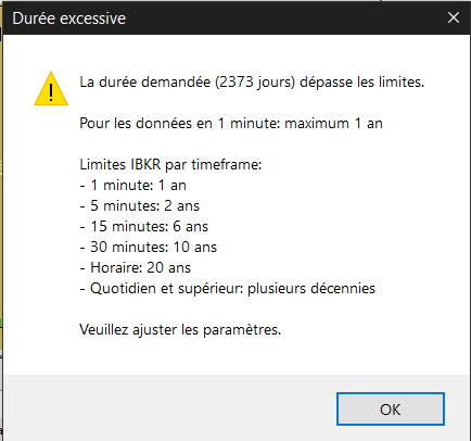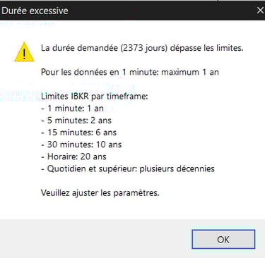 De nouveau les limites API IBKR s'appliquent ici. Respectez les durées maximales et leurs "timeframe" associés.