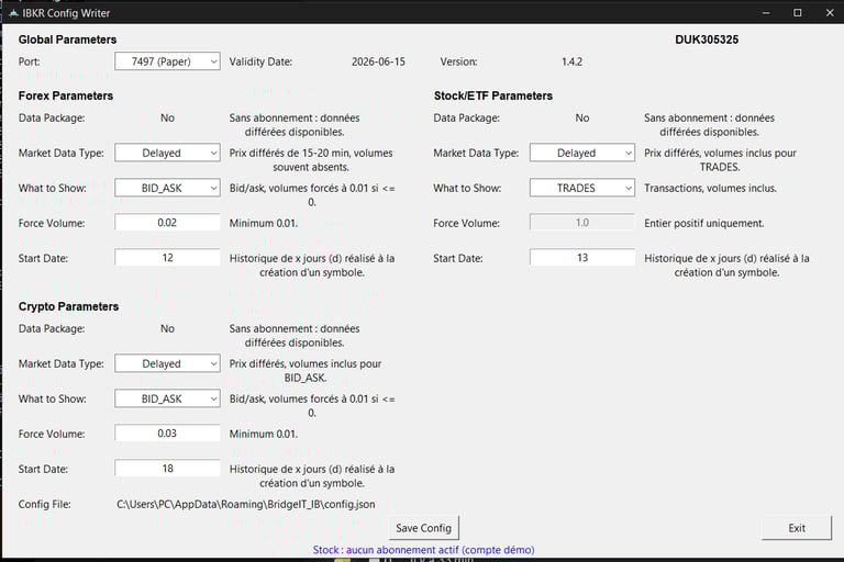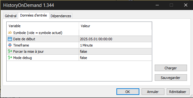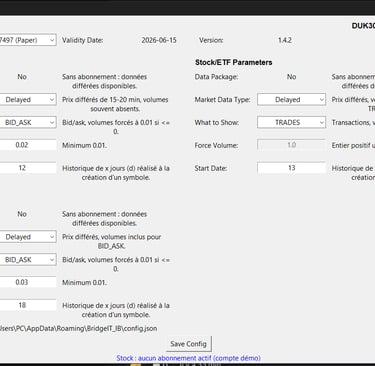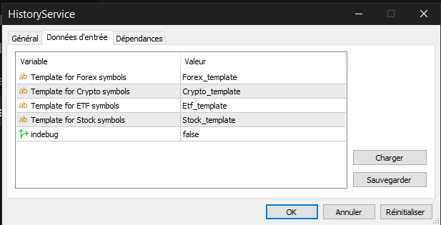 HISTORYSERVICE --> se charge de mettre à jour automatiquement l'historique de chaque graphique qui est ouvert dans l'interface mt5. Il répond aux paramètres de configuration.--> Accès aux paramètres. Il est soumis au "pacing" d'ibrk et peut donc prendre du temp à mettre à jour.